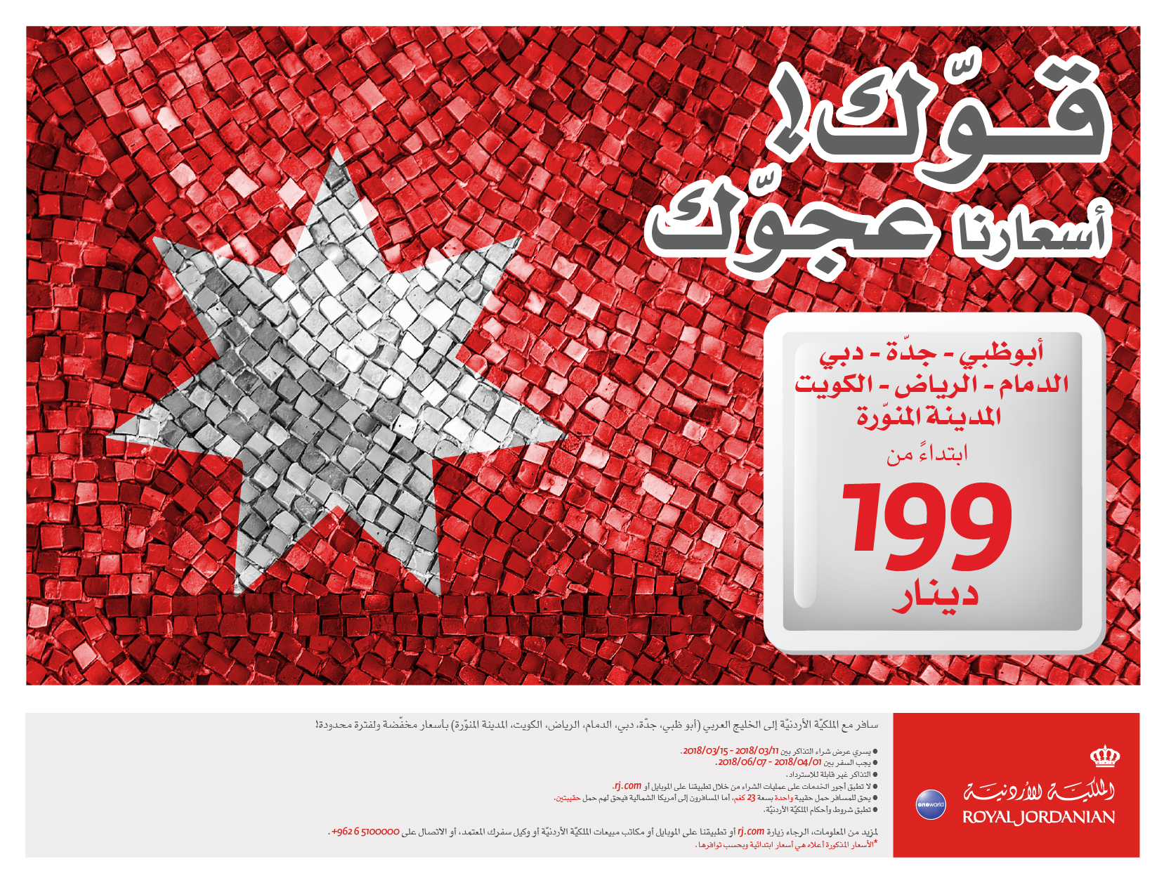 عمان -11/3/2018، ويستطيع المسافرون الحجز وشراء تذاكر سفرهم بموجب هذا العرض بقيمة 199 دينار للتذكرة شاملة الضرائب، خلال الفترة ما بين 11/3 وحتى 15/3/2018 للسفر بهذه التذاكر بين الأول من شهر نيسان المقبل وحتى السابع من شهر حزيران من العام الحالي.
