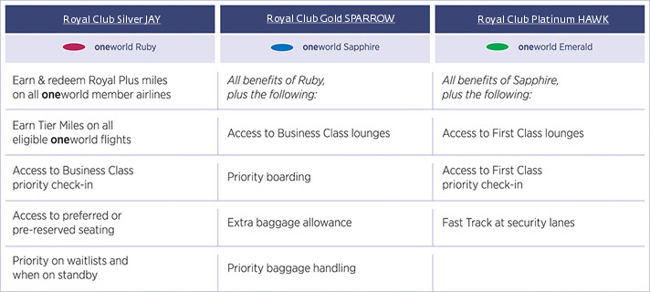 Enjoy exclusive access to premium airport lounges around the world with Royal Club Platinum and Gold status. Members of oneworld airline frequent flyer programmes with the equivalent of oneworld Emerald or Sapphire tier status can use any lounge offered by any oneworld airline when departing on any flight marketed and operated by any oneworld member airline, regardless of cabin class being flown.