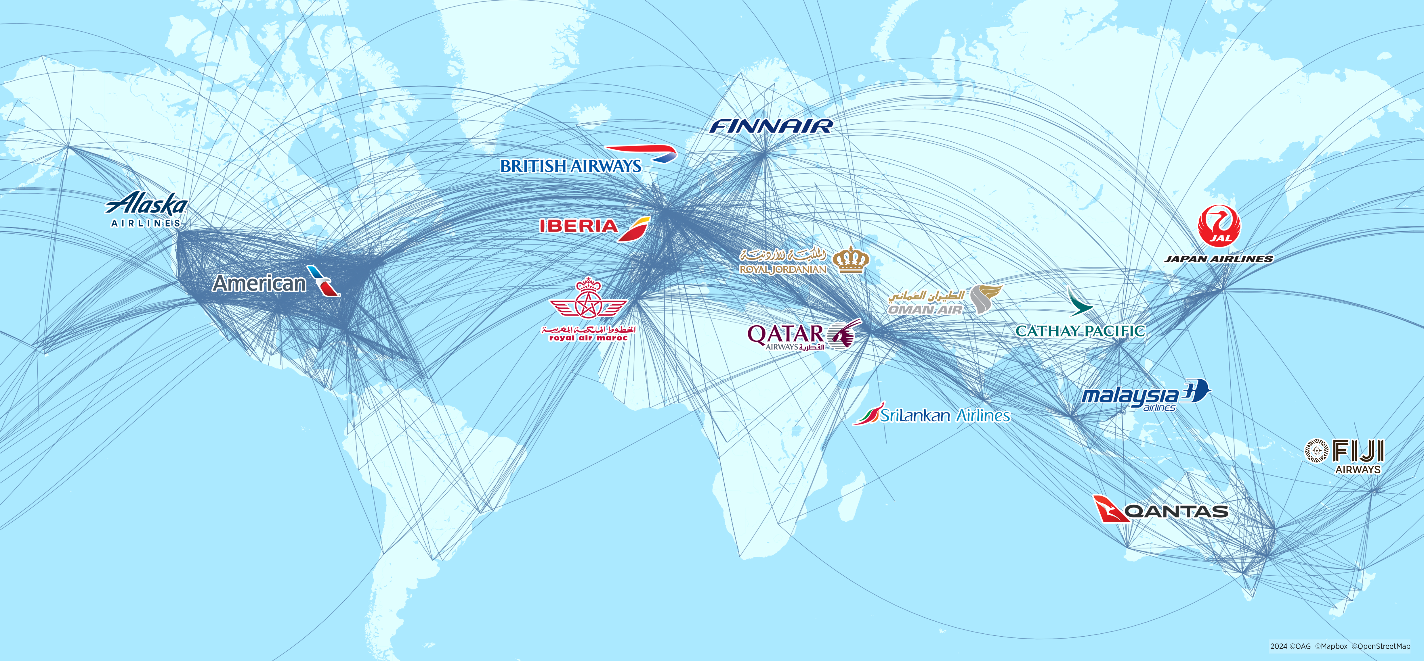 oneworld members include Alaska AirlinesAmerican Airlines, British Airways, Cathay Pacific, Fiji Airways, Finnair, Iberia,Japan AirlinesMalaysia Airlines, Qantas, Qatar Airways, Oman Air, Royal Air MarocRoyal Jordanian and SriLankan Airlines, and around 26 affiliates.